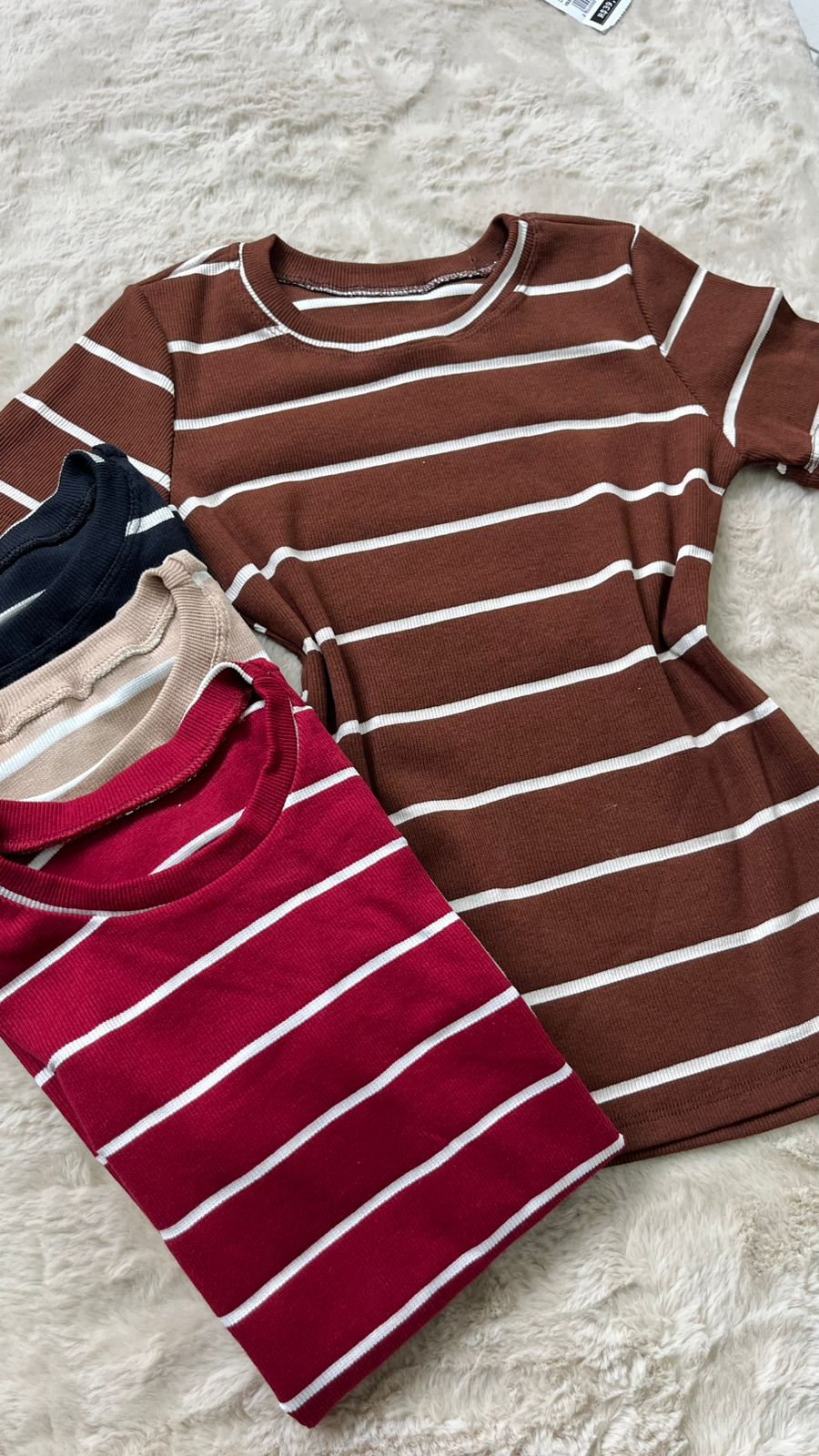 Blusa feminina confeccionada em tecido canelado, com estampa listrada e caimento confortável, exatamente como você vê nas fotos. O modelo não possui gola, trazendo um visual básico e versátil, ideal para o uso no dia a dia. Possui modelagem prática e confortável, facilitando combinações com diferentes peças e estilos.