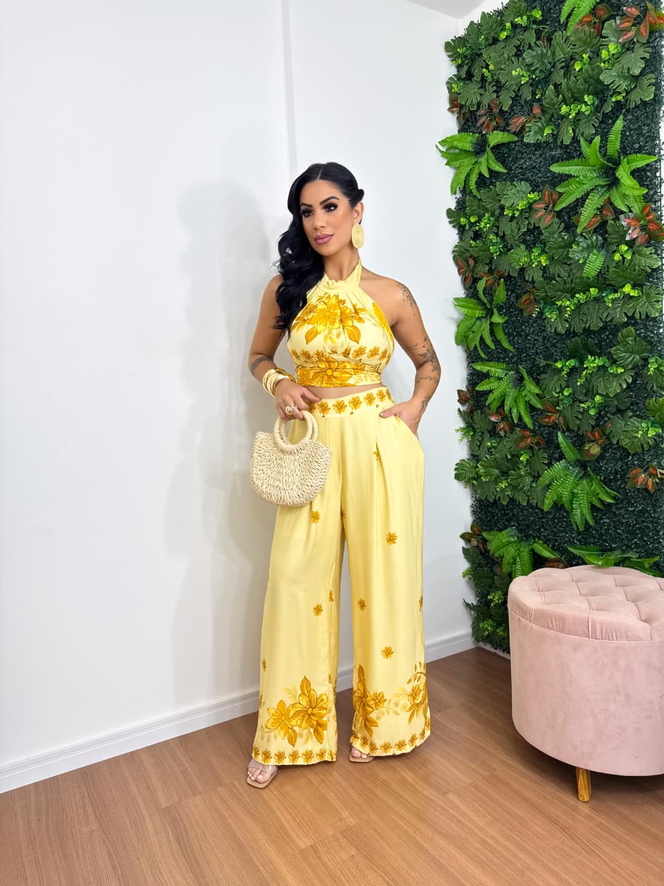 Conjunto feminino confeccionado em tecido de viscolinho com forro interno, garantindo conforto, leveza e excelente caimento. O cropped é modelo frente única, com amarração no pescoço e nas costas, além de possuir bojo estruturado que valoriza o busto e oferece sustentação.