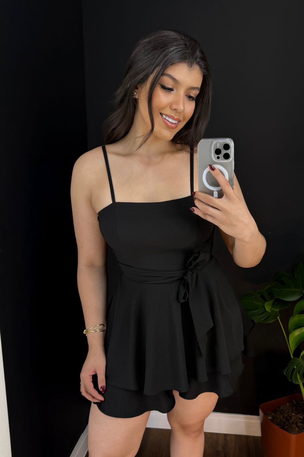 O design moderno com saia sobreposta em camadas traz movimento e delicadeza, tornando a peça versátil para ocasiões casuais ou eventos especiais.