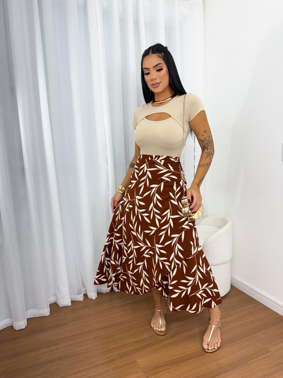 Saia modelo envelope confeccionada em tecido visco-linho, que une leveza, conforto e um visual sofisticado. O modelo possui transpasse frontal, permitindo ajuste prático ao corpo e proporcionando um caimento fluido que valoriza a silhueta.