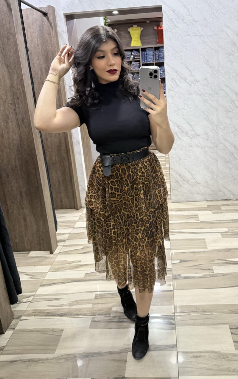 Saia midi em tecido tule com estampa animal print, trazendo um visual moderno e elegante.