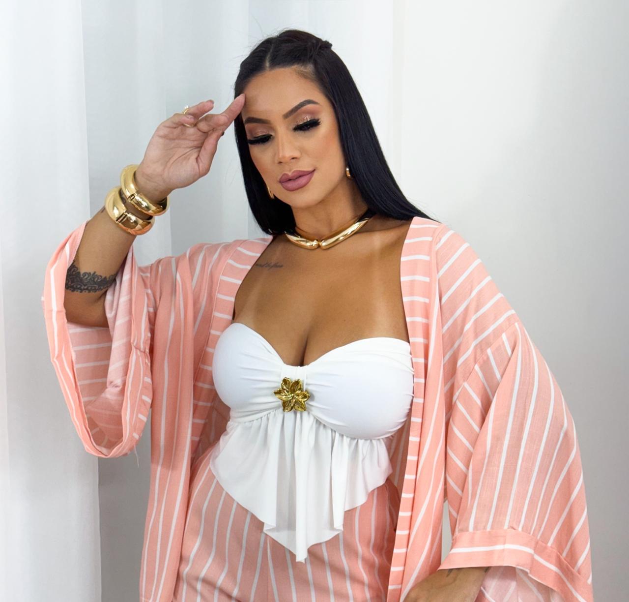 Cropped confeccionado em tecido suplex, com caimento confortável e ótimo ajuste ao corpo, exatamente como você vê nas fotos. O modelo possui detalhe delicado de flor no centro do busto, que valoriza a peça e traz um toque especial ao visual. Conta com bojo, oferecendo melhor sustentação e segurança no uso. Uma peça moderna e versátil, ideal para compor looks estilosos e confortáveis.