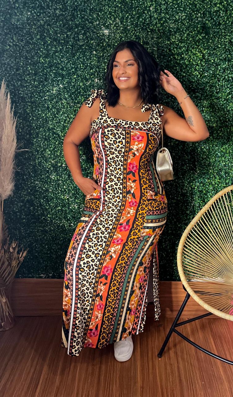 Vestido feminino confeccionado em malha de viscose com elastano, oferecendo excelente elasticidade, conforto e ajuste ao corpo. A estampa moderna combina elementos florais e animal print, trazendo personalidade e estilo à peça.