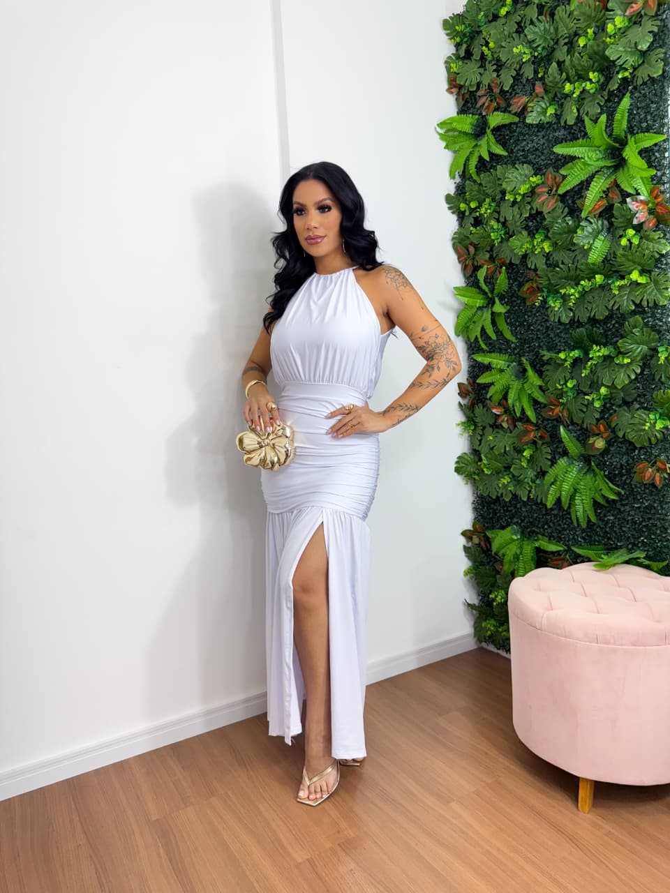 Vestido longo em poliamida, com caimento leve e toque super confortável. O modelo veste do 38 ao 42, graças ao tecido que estica bem e se ajusta ao corpo. Ele possui fenda lateral, trazendo movimento e um toque sofisticado ao look.